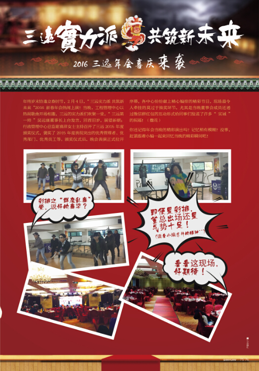 年終歲末恰逢立春時(shí)節(jié),2月4日,“三遠(yuǎn)實(shí)力派 共筑新未來”2016新春年會(huì)熱鬧上演!當(dāng)晚,工程管理中心以熱鬧歌曲開場(chǎng)相邀,三遠(yuǎn)的實(shí)力派們歡聚一堂。“三遠(yuǎn)第一帥”吳遠(yuǎn)康董事長(zhǎng)上臺(tái)發(fā)言,回首舊歲,展望新朝;行政管理中心總監(jiān)謝喜萍女士主持召開了三遠(yuǎn)2015年度頒獎(jiǎng)儀式,褒獎(jiǎng)了2015年度表現(xiàn)突出的優(yōu)秀管理者、優(yōu)秀部門、優(yōu)秀員工等。頒獎(jiǎng)儀式后,晚會(huì)表演正式拉開序幕,各中心紛紛獻(xiàn)上精心編排的精彩節(jié)目,現(xiàn)場(chǎng)最令人牽掛的莫過于抽獎(jiǎng)環(huán)節(jié),尤其是當(dāng)晚董事會(huì)成員還通過微信群紅包的互動(dòng)形式給同事們發(fā)送了許多“實(shí)誠(chéng)”的祝福!(撒花)
