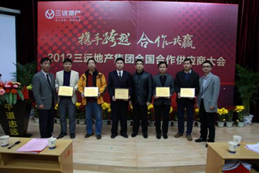 大會上,三遠地產集團向5家優秀供應商伙伴頒發了“優秀合作單位”獎牌,借以表彰他們在2010-2011年度與三遠地產集團良好的合作關系。多家與會合作企業領導人登臺表達了與三遠地產集團的合作印象,高度贊揚了三遠地產強力有效的供應商管理制度以及“跨越發展、合作共贏”的合作原則。