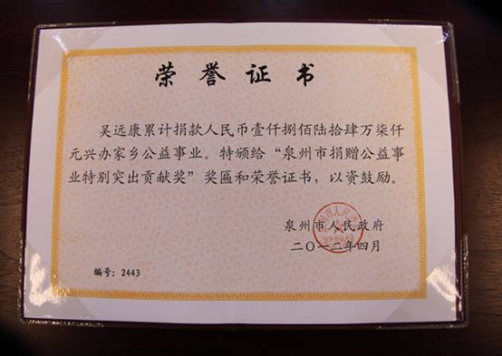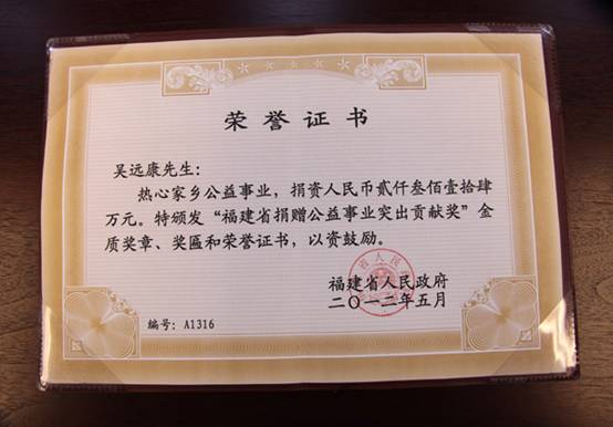 2012年6月,集團(tuán)董事長、總裁吳遠(yuǎn)康先生因其長期熱心公益事業(yè)、恩澤桑梓,受到了福建省人民政府、泉州市人民政府的高度重視與評價。福建省政府、泉州市政府分別授予了吳遠(yuǎn)康先生“福建省捐贈公益事業(yè)突出貢獻(xiàn)獎”、“泉州市捐贈公益事業(yè)特別突出貢獻(xiàn)獎”金質(zhì)獎?wù)隆ⅹ勜壹皹s譽(yù)證書。與此同時,福建省人民政府、泉州市人民政府還專門發(fā)文批復(fù)了晉江市人民政府關(guān)于對吳遠(yuǎn)康先生捐資興辦公益事業(yè)給予立碑表彰的決定。 吳遠(yuǎn)康先生作為三遠(yuǎn)集團(tuán)的掌舵人,發(fā)軔于上世紀(jì)九十年代初,經(jīng)過二十多年的艱苦創(chuàng)業(yè),其所領(lǐng)導(dǎo)的三遠(yuǎn)集團(tuán)業(yè)務(wù)涵蓋房地產(chǎn)、紡織、教育、物業(yè)管理四大領(lǐng)域,下屬公司主要分布在香港、北京、深圳、惠州、泉州、廈門、漳州等熱點(diǎn)城市。 在事業(yè)蓬勃發(fā)展之時,吳遠(yuǎn)康先生從不忘承擔(dān)企業(yè)社會責(zé)任。長期以來,吳遠(yuǎn)康先生熱心公益、慷慨解囊回饋社會,已累計向社會捐贈達(dá)2300多萬元,資金主要用于慈善、教育等公益事業(yè)。1998年,他捐贈超過600萬元興建晉江市三遠(yuǎn)大道及棲梧小學(xué);1999年,他斥巨資獨(dú)家捐贈福建省體操隊(duì);2007年,吳遠(yuǎn)康先生被晉江市政府授予“慈善家”稱號;2008年,龍海市人民政府授予吳遠(yuǎn)康先生“慈善家”稱號;2011年,他捐建三明市上青鄉(xiāng)僑心小學(xué)新教學(xué)樓……吳遠(yuǎn)康先生所有的這些賑災(zāi)慈善和愛心善舉,皆受到了各級政府、社會各界及家鄉(xiāng)人民的充分肯定和高度評價,堪稱愛國愛鄉(xiāng)的社會楷模。 吳遠(yuǎn)康先生榮獲“福建省捐贈公益事業(yè)突出貢獻(xiàn)獎”榮譽(yù)證書 吳遠(yuǎn)康先生榮獲“泉州市捐贈公益事業(yè)特別突出貢獻(xiàn)獎”榮譽(yù)證書 吳遠(yuǎn)康先生榮獲“福建省捐贈公益事業(yè)突出貢獻(xiàn)獎”金質(zhì)獎?wù)?/div> 吳遠(yuǎn)康先生榮獲“福建省捐贈公益事業(yè)突出貢獻(xiàn)獎”獎匾 吳遠(yuǎn)康先生榮獲“泉州市捐贈公益事業(yè)特別突出貢獻(xiàn)獎”獎匾